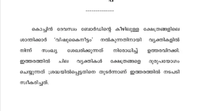 തൃശൂര്: തൃശൂര് വടക്കുംനാഥ ക്ഷേത്രത്തില് വിഷു കൈനീട്ടം നല്കാനായി നടന് സുരേഷ് ഗോപി മേല്ശാന്തിയെ പണം ഏല്പിച്ചത് വിവാദത്തില്.ഇതേത്തുടർന്ന് ദര്ശനത്തിനെത്തുന്നവര്ക്ക് നല്കാന് ശാന്തിക്കാര് വ്യക്തികളില് നിന്ന് പണം സ്വീകരിക്കരുതെന്ന് കൊച്ചിന് ദേവസ്വം ബോര്ഡ് ഉത്തരവിറക്കി. തൃശൂര് ജില്ലയുടെ വിവിധ ഇടങ്ങളില് കഴിഞ്ഞ ഒരാഴ്ച മുതല് സുരേഷ് ഗോപിയുടെ നേതൃത്വത്തില് ബി.ജെ.പി വിഷു കൈനീട്ടം പരിപാടി സംഘടിപ്പിച്ചിരുന്നു.കൊച്ചിന് ദേവസ്വം ബോര്ഡിന് കീഴിലെ വടക്കുംനാഥ ക്ഷേത്രത്തില് മേല്ശാന്തിക്ക് പണം നല്കിയതാണ് വിവാദത്തിലായത്.വിഷു ദിനത്തില് ക്ഷേത്രത്തിലെത്തുന്നവര്ക്ക് നല്കാന് ഒരു രൂപയുടെ 1000 നാണയ തുട്ടുകളാണ് സുരേഷ് ഗോപി മേൽശാന്തിക്ക് നല്കിയത്. വിഷു കൈനീട്ടത്തിന് രാഷ്ട്രീയ മാനം കൈവന്നതോടെ കൊച്ചിന് ദേവസ്വം ബോര്ഡ് ശാന്തിമാര്ക്ക് കര്ശന നിര്ദേശം നല്കുകയായിരുന്നു.സുരേഷ് ഗോപിയുടെ പേരെടുത്ത് പറയാതെയാണ് ഉത്തരവിറക്കിയതെങ്കിലും, ചില വ്യക്തികള് വിഷു കൈനീട്ടത്തിന്റെ പേരില് ക്ഷേത്രത്തെ ദുരുപയോഗം ചെയ്യുന്നത് ശ്രദ്ധയില് പെട്ടതിനാലാണ് നടപടിയെന്നും ദേവസ്വം കമ്മീഷണര് വ്യക്തമാക്കുന്നു. നിലവിൽ രാജ്യസഭാ എംപിയായ സുരേഷ് ഗോപിയുടെ കാലാവധി വരുന്ന ജൂണോടെ…