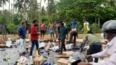 തൃശ്ശൂരിൽ നിന്നും മദ്യക്കുപ്പികളുമായ പോയ ലോറി മറിഞ്ഞു; മദ്യക്കുപ്പികൾ പെറുക്കാൻ നാട്ടുകാരുടെ മത്സരം