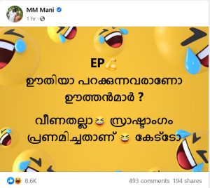 തിരുവനന്തപുരം: വിമാനത്തിലെ പ്രതിഷേധത്തില് യൂത്ത് കോണ്ഗ്രസിനെ പരിഹസിച്ച് എം.എം.മണി എം.എല്.എ. ഇ.പി ഊതിയാ പറക്കുന്നതാണോ ഊത്തന്മാരെന്നും വീണതല്ല സ്രാഷ്ട്ടാംഗം പ്രണമിച്ചതാണ് കേട്ടോയെന്നുമായിരുന്നു ഫെയ്സ്ബുക്കില് പങ്കുവച്ച കുറിപ്പില് എംഎം മണി പരിഹസിച്ചത്.