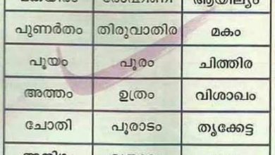 ഓരോ നക്ഷത്രത്തിലും ജനിച്ചവരുടെ ഭാഗ്യദിനം 1.അശ്വതി – ചൊവ്വ 2.ഭരണി – ചൊവ്വ, വെള്ളി 3.കാർത്തിക – ഞായർ 4.രോഹിണി – തിങ്കൾ 5.മകയിരം – ചൊവ്വ 6.തിരുവാതിര – വെള്ളി 7.പുണർതം – വ്യഴം 8.പൂയം – ശനി 9.ആയില്യം – ബുധൻ 10.മകം – വെള്ളി 11.പൂരം – വെള്ളി 12.ഉത്രം – ഞായർ 13.അത്തം – തിങ്കൾ 14.ചിത്തിര – ചൊവ്വ 15.ചോതി – വെള്ളി 16.വിശാഖം – വ്യഴം 17.അനിഴം – ശനി 18.തൃകേട്ട – ബുധൻ 19.മൂലം – വെള്ളി 20.പൂരാടം – വെള്ളി 21.ഉത്രടം – ഞായർ 22.തിരുവോണം – തിങ്കൾ 23.അവിട്ടം – ചൊവ്വ 24.ചതയം – വെള്ളി 25.പൂരുട്ടാതി – വ്യഴം 26.ഉതൃട്ടാതി – ശനി 27.രേവതി – ബുധൻ xxxxxxxxxxxxxxxxxxxxxx ഓരോ നക്ഷത്രത്തിലും ജനിച്ചവരുടെ ഭാഗ്യ സംഖ്യ 1.അശ്വതി – 7 & 9 2.ഭരണി – 9…