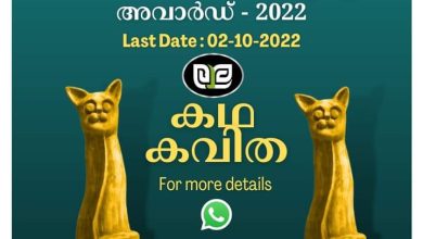 “അ” ഹൈദരാബാദ് (ARTS) ലോക മലയാളികൾക്കായി നടത്തി വരുന്ന മലയാള കഥാ കവിതാ മത്സര-പുരസ്കാരത്തിലേക്ക് രചനകൾ ക്ഷണിക്കുന്നു. പ്രശസ്ത ചലച്ചിത്ര കലാ സംവിധായകൻ ശ്രീ. രാജീവ് നായർ രൂപകല്പന ചെയ്ത “GOLDEN CAT” ശിൽപവും, പ്രശംസാപത്രവും, 25000 രൂപയുമടങ്ങുന്നതാണ് അവാർഡ്. മലയാള കഥ, കവിത വിഭാഗങ്ങളിലായി രണ്ട് പുരസ്കാരങ്ങളാണുള്ളത്. മലയാളത്തിലെ പ്രശസ്ത സാഹിത്യ പ്രവർത്തകർ വിധികർത്താക്കളാകുന്ന ഗോൾഡൻ ക്യാറ്റ് ലിറ്റററി അവാർഡിൻ്റെ ഫലപ്രഖ്യാപനം 2022 നവംബർ അവസാനവാരം ഓൺലൈൻ മീറ്റിംഗിലൂടെ നിർവഹിക്കപ്പെടുന്നതാണ്. തുടർന്ന്, ആഴ്ചകൾക്കകം, ഹൈദരാബാദിൽ വെച്ച് നടക്കുന്ന ചടങ്ങിൽ പുരസ്കാരദാനം നടക്കും (പ്രസ്തുത സമയം, കോവിഡ് വ്യാപന നിയന്ത്രണങ്ങൾ ഉണ്ടെങ്കിൽ സമ്മാനങ്ങൾ രചയിതാക്കളുടെ ഇന്ത്യൻ അഡ്രസ്സിൽ അയച്ചു കൊടുക്കുന്നതാണ്) മത്സരത്തെ കുറിച്ച്: രചനകൾ മൗലികവും മറ്റെവിടെയും പ്രസിദ്ധീകരിക്കാത്തതും ആയിരിക്കണം. രചനകളിൽ പ്രമേയതെരഞ്ഞെടുപ്പ് സ്വതന്ത്രമായിരിക്കും. ആഴ്ചപ്പതിപ്പുകളിൽ അച്ചടിച്ചു വരുന്ന സാമാന്യ വലിപ്പമായിരിക്കും അഭികാമ്യം. രചയിതാക്കൾ ഏതെങ്കിലും ഒരു വിഭാഗത്തിൽ മാത്രമേ പങ്കെടുക്കാൻ പാടുള്ളൂ. കൃതികൾ രചയിതാവിന്റെ പേര്,…