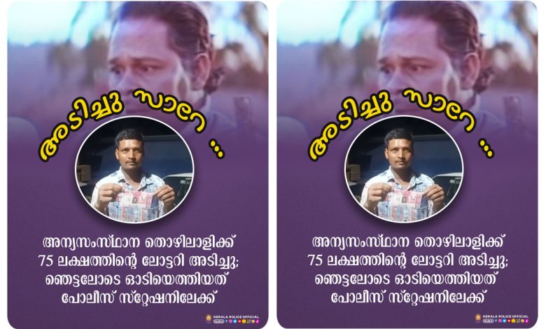 തൊടുപുഴ: സ്ത്രീശക്തി ലോട്ടറിയുടെ 75 ലക്ഷം രൂപ ഒന്നാം സമ്മാനം അടിച്ച ഞെട്ടലിൽ അന്യസംസ്ഥാന തൊഴിലാളി ഓടിയെത്തിയത് മൂവാറ്റുപുഴ പൊലീസ് സ്റ്റേഷനിലേക്ക്. കൊൽക്കത്ത സ്വദേശിയായ എസ്.കെ. ബദേസ് ആണ് ലോട്ടറി അടിച്ച പരിഭ്രാന്തിയിൽ പൊലീസിന്റെ സഹായം തേടിയെത്തിയത്. ഒന്നാം സമ്മാനം അടിച്ച കാര്യം അറിഞ്ഞപ്പോൾ എന്തുചെയ്യണമെന്നറിയാതെ പകച്ചുപോയ ബദേസ് നേരെ പൊലീസ് സ്റ്റേഷനിലെത്തി ഉദ്യോഗസ്ഥരോട് കാര്യം അറിയിക്കുകയായിരുന്നു.