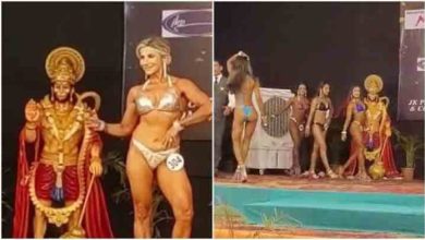 ഹനുമാന് ചിത്രത്തിനു മുന്നില് ബിക്കിനി ധരിച്ച് വനിതാ ബോഡിബില്ഡര്മാര്; ‘ഗംഗാ ജലം’ തളിച്ച് കോണ്ഗ്രസ് പ്രവര്ത്തകര്