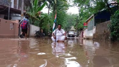 റോഡിലെ വെള്ളക്കെട്ടിൽ കുത്തിയിരുന്ന് കോൺഗ്രസ് നേതാവിന്റെ പ്രതിഷേധം