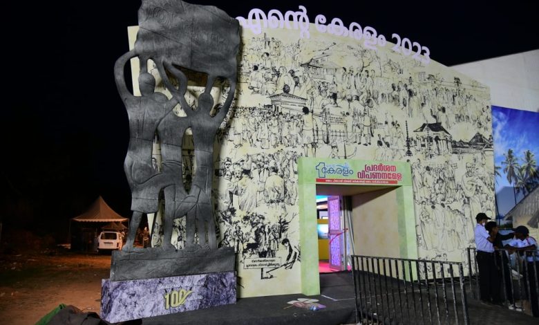 കോട്ടയം: വൈക്കം സത്യഗ്രഹം ശതാബ്ദി ചരിത്രം വിളിച്ചോതി എന്റെ കേരളം പ്രദർശന വിപണന മേളയുടെ പ്രവേശന കവാടം. സത്യഗ്രഹത്തിന്റെ ചരിത്രത്തിലേക്കും പൈതൃകത്തിലേക്കും കാഴ്ചക്കാരെ നയിക്കുന്ന രീതിയിലാണ് കവാടം തയാറാക്കിയിരിക്കുന്നത്. 23 അടി നീളത്തിലും 90 അടി വീതിയിലും തയ്യാറാക്കിയ കവാടത്തിൽ സത്യഗ്രഹത്തിന്റെ പ്രധാന സംഭവങ്ങൾ ചിത്രങ്ങളായി ആലേഖനം ചെയ്തിട്ടുണ്ട്. വൈക്കം സത്യഗ്രഹം സ്മാരക പ്രതിമ, ഗാന്ധിജി വൈക്കം ബോട്ട് ജെട്ടിയിൽ വന്നിറങ്ങുന്ന ദൃശ്യം, സത്യാഗ്രഹസേനാനികളുടെ ചിത്രങ്ങൾ, പ്രതിമകൾ, മഹാറാണി സേതുലക്ഷ്മി മുൻപാകെയുള്ള മെമ്മോറാണ്ടം സമർപ്പണ ദൃശ്യം എന്നിവ പ്രധാന കവാടത്തിന് ഇരുവശത്തുമായി ചിത്രീകരിച്ചിരിക്കുന്നു.