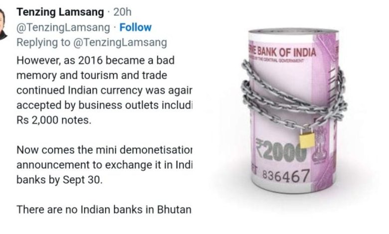 പക്ഷേ, പിന്നീട് 2,000ന്റെ നോട്ട് അവതരിപ്പിച്ചപ്പോള് അതും ഭൂട്ടാനിലെയും നേപ്പാളിലെയും ബംഗ്ലാദേശിലെയും വ്യാപാരികള് സ്വീകരിച്ചു. ഇപ്പോള് ആ നോട്ടും അസാധുവാക്കിയിരിക്കുന്നു. എന്നാല്, നോട്ട് മാറ്റിയെടുക്കാനുള്ള സൗകര്യം ഇന്ത്യയിലെ ബാങ്കുകളിലേ നിലവിലുള്ളൂ.ഭൂട്ടാനില് ഇന്ത്യന് ബാങ്കുകള് പ്രവര്ത്തിക്കുന്നില്ല.ഭൂട്ടാന്റെ കേന്ദ്രബാങ്ക് 2,000ന്റെ നോട്ട് സ്വീകരിക്കുകയോ മാറ്റിനല്കുകയോ ചെയ്യുന്നില്ല.ജനങ്ങൾ എന്ത് ചെയ്യണമെന്നും അദ്ദേഹം ചോദിച്ചു.