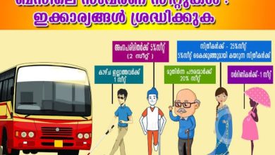 ബസുകളിലെ സംവരണ സീറ്റുമായി ബന്ധപ്പെട്ട് മോട്ടോർ വാഹന വകുപ്പിന്റെ അറിയിപ്പ്: കെ.എസ്.ആര്.ടി.സി വോള്വോ, എ.സി ബസുകള് ഒഴികെയുള്ള എല്ലാ ബസുകളിലും 25 ശതമാനം സീറ്റുകള് സ്ത്രീകള്ക്കായി സംവരണം ചെയ്തിട്ടുണ്ട്.ഇതിൽ അഞ്ച് ശതമാനം ഗർഭിണികൾക്കുള്ളതാണ്. റിസർവേഷൻ സൗകര്യമുള്ള ബസുകൾക്ക് ഇത് ബാധകമല്ല. ദീര്ഘദൂര ബസുകളിൽ സ്ത്രീകള്ക്ക് മുന്ഗണനയുള്ള സീറ്റില് പുരുഷന്മാർക്ക് ഇരിക്കാൻ പാടുള്ളതല്ല.ദീര്ഘദൂര ബസുകളില് സ്ത്രീകളുടെ സീറ്റില് ആളില്ലെങ്കിലേ പുരുഷന്മാര്ക്ക് ഇരിക്കാനാവൂ.സ്ത്രീകള് കയറിയാല് അവരുടെ സീറ്റില് ഇരിക്കുന്ന പുരുഷന്മാര് എഴുന്നേറ്റ് കൊടുക്കുക തന്നെ വേണം.നിയമം ലംഘിച്ചാൽ പിഴ ഈടാക്കും.സീറ്റില്നിന്ന് മാറാന് തയാറാകാതെ കണ്ടക്ടറോട് തർക്കിച്ചാൽ കൃത്യനിർവഹണം തടസ്സപ്പെടുത്തിയതിന് ക്രിമിനല് നടപടി പ്രകാരം കേസെടുക്കാം. ബസിലെ സംവരണ സീറ്റുകള് : *അഞ്ച് ശതമാനം അംഗപരിമിതര്ക്ക് *കാഴ്ചയില്ലാത്തവര്ക്ക് ഒരു സീറ്റ് *20 ശതമാനം സീറ്റ് മുതിര്ന്ന പൗരന്മാര്ക്ക് *20 ശതമാനം സീറ്റുകള് സ്ത്രീകള്ക്ക് *അഞ്ച് ശതമാനം സീറ്റ് കൈക്കുഞ്ഞുമായി കയറുന്ന സ്ത്രീകള്ക്ക് *ഒരു സീറ്റ് ഗര്ഭിണിക്ക്