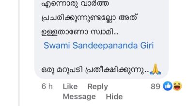 തിരുവനന്തപുരം: സ്വാമി സന്ദീപാനന്ദ ഗിരിക്ക് മർദ്ദനമേറ്റതായി വാർത്ത.എന്നാൽ ഇത് തള്ളിയ സ്വാമി സന്ദീപാനന്ദ ഗിരി തനിക്കെതിരെ നടക്കുന്ന വ്യാജ പ്രചാരണങ്ങളിൽ ഒന്നുമാത്രമാണ് ഇതെന്ന് പറഞ്ഞു. ‘സ്വാമിയെ ആരോ തല്ലിച്ചതച്ചു എന്ന് കേൾക്കുന്നുണ്ടല്ലോ? ഉള്ളതാണോ സ്വാമി? ഒരു മറുപടി പ്രതീക്ഷിക്കുന്നു’ എന്ന ഫേസ്ബുക്ക് കമന്റ് പങ്ക് വച്ചു കൊണ്ടായിരുന്നു സ്വാമിയുടെ മറുപടി. കമന്റിന് സന്ദീപാനന്ദ ഗിരി കൃത്യ മറുപടി നൽകുന്നുമുണ്ട്. ‘ഇത് ഊപിയല്ല, സ്വാമിയുടെ ദേഹത്ത് കൈവെച്ചവന്റെ മുട്ടുകാൽ മലയാളികൾ തല്ലിയൊടിക്കും. അത് കട്ടായം’ എന്നാണ് സന്ദീപാനന്ദ ഗിരി മറുപടി നൽകുന്നത്. സന്ദീപാനന്ദ ഗിരി തന്നെയാണ് ഇതിന്റെ സ്ക്രീൻ ഷോട്ട് തന്റെ ഫേസ്ബുക്കിൽ പങ്കുവെച്ചിരിക്കുന്നത്. അതേസമയം, സ്വാമി സന്ദീപാനന്ദ ഗിരിയുടെ കുണ്ടമൺകടവിലെ ആശ്രമം കത്തിച്ച കേസിൽ ബി.ജെ.പി പ്രവർത്തകനും മൂന്നാം പ്രതിയുമായ ശബരി എസ്.നായർക്ക് കഴിഞ്ഞ ദിവസം ജാമ്യം അനുവദിച്ചിരുന്നു. തിരുവനന്തപുരം നാലാം അഡി. സെഷൻസ് കോടതി ജഡ്ജി എസ്.രാധാകൃഷ്ണന്റേതാണ് ഉത്തരവ്. ഉപാധികളോടെയാണ് ജാമ്യം. സമാനമായ കേസുകളിൽ അകപ്പെടാനോ സമൂഹത്തിൽ ഭീകരാന്തരീഷം…