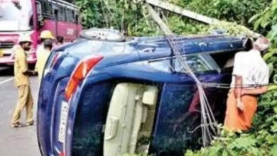 കാര് വൈദ്യുതി തൂണിലിടിച്ച് മറിഞ്ഞു; യാത്രക്കാർ അത്ഭുതകരമായി രക്ഷപ്പെട്ടു