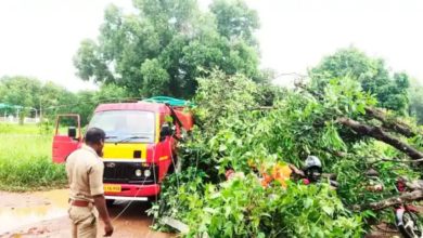 തൃശൂരിൽ ഓടിക്കൊണ്ടിരുന്ന വണ്ടിക്കു മുകളിലേക്കു മരവും ഇലക്ട്രിക് പോസ്റ്റും ഒടിഞ്ഞുവീണു