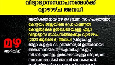 കോട്ടയം: ശക്തമായ മഴ സാധ്യത കണക്കിലെടുത്തു കോട്ടയം ജില്ലയിൽ നാളെ കേന്ദ്ര കാലാവസ്ഥാ വകുപ്പ് മഞ്ഞ അലെർട്ട് പ്രഖ്യാപിച്ചു. ഒറ്റപ്പെട്ട ശക്തമായ മഴയ്ക്കുള്ള സാധ്യതയാണ് പ്രവചിച്ചിട്ടുള്ളത്. 24 മണിക്കൂറിൽ 64.5 മില്ലിമീറ്റർ മുതൽ 115.5 മില്ലിമീറ്റർ വരെ മഴ ലഭിക്കുന്ന സാഹചര്യത്തെയാണ് ശക്തമായ മഴ എന്നത് കൊണ്ട് അർത്ഥമാക്കുന്നത്. കനത്ത മഴ തുടരുന്ന സാഹചര്യത്തിൽ ജില്ലയിൽ 27 ദുരിതാശ്വാസ ക്യാമ്പുകൾ തുറന്നു. കോട്ടയം താലൂക്ക് – 19, ചങ്ങനാശേരി താലൂക്ക് – 4, മീനച്ചിൽ – 3 കാഞ്ഞിരപ്പള്ളി – ഒന്ന് എന്നിങ്ങനെയാണ് ക്യാമ്പുകളുടെ എണ്ണം. 124 കുടുംബങ്ങളിലായി 407 പേർ വിവിധ ക്യാമ്പുകളിലുണ്ട്. ഇതിൽ 152 പുരുഷന്മാരും 181 സ്ത്രീകളും 74 കുട്ടികളുമാണുള്ളത്. അതിശക്തമായ മഴ തുടരുന്ന സാഹചര്യത്തിൽ കോട്ടയം ജില്ലയിലെ പ്രൊഫഷണൽ കോളജുകൾ ഉൾപ്പെടെയുള്ള എല്ലാ വിദ്യാഭ്യാസ സ്ഥാപനങ്ങൾക്കും വ്യഴാഴ്ച (2023 ജൂലൈ ആറ്) അവധി പ്രഖ്യാപിച്ച് ജില്ലാ കളക്ടർ വി. വിഗ്നേശ്വരി ഉത്തരവായി. അങ്കണവാടികൾ, ഐ.സി.എസ്.ഇ./സി.ബി.എസ്.ഇ. ഉൾപ്പെടെയുള്ള…