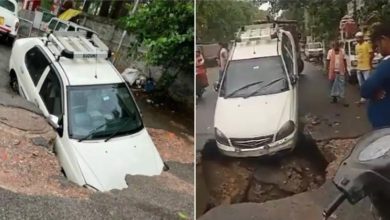 റോഡിന് നടുവിലെ കൂറ്റൻ ഗർത്തത്തിൽ മൂക്കുകുത്തി കാർ