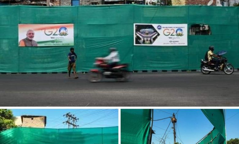 ന്യൂഡൽഹി: ചേരികൾ മുഴുവൻ മറച്ചുകെട്ടി ജി20 സമ്മേളനത്തിന് ഡൽഹിയിൽ തുടക്കമായി.എയർപോർട്ട് മുതൽ പ്രധാന വേദിയായ പ്രകൃതി മൈതാൻ വരെയുള്ള ചേരികൾ പ്ലാസ്റ്റിക് കൊണ്ട് ഭംഗിയായി മറച്ചിട്ടുണ്ട്. ഡൽഹിയിലെ പ്രധാന റോഡുകൾക്ക് പിന്നിലുള്ള ചേരികളും മറച്ചു. യാഥാർഥ്യത്തിനു നേരേ മറച്ചു കെട്ടിയിയിരിക്കുന്ന മറയ്ക്ക് മേൽ മോഡിയുടെ ചിരിച്ച മുഖം ആവോളം പതിച്ചിട്ടുമുണ്ട്.