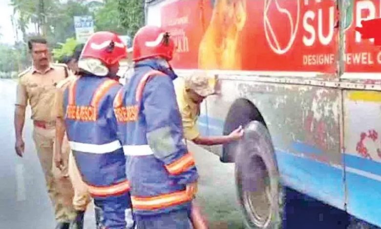 രണ്ടുകൈ -ചാലക്കുടി റൂട്ടില് ഓടുന്ന ഓര്ഡിനറി ബസാണ് അപകടത്തില്പ്പെട്ടത്. ഓടിക്കൊണ്ടിരിക്കേ പിൻവശത്തെ ടയറിന് തീപിടിക്കുകയായിരുന്നു.