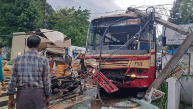 പത്തനംതിട്ട:എം സി റോഡില് പന്തളം പറന്തലില് കെ എസ് ആര് ടി സി ബസും ബസും പിക്കപ്പ് വാനും കൂട്ടിയിടിച്ച് രണ്ട് പേര് മരിച്ചു. ഇന്ന് രാവിലെ 7.45ഓടെയാണ് അപകടം.എറണാകുളം ജില്ലയിലെ കിഴക്കമ്ബലം സ്വദേശി ജോണ്സണ് മാത്യു ( 48), ഇടത്തല സ്വദേശി ശ്യാം (30) എന്നിവരാണ് മരിച്ചത്. ബസ് യാത്രക്കാരായ 25 പേര്ക്ക് പരുക്കേറ്റിട്ടുണ്ട്. വാനില് ഉണ്ടായിരുന്നവര് ഉറങ്ങിപ്പോയതാകം ആപകട കാരണമെന്നാണ് കരുതുന്നത്.