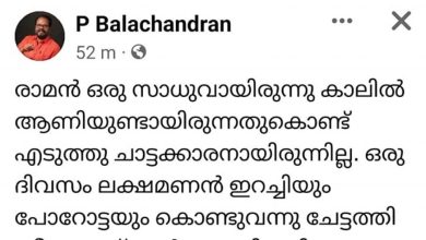 തൃശൂര്: രാമായണവുമായി ബന്ധപ്പെട്ട് സമൂഹമാധ്യമത്തില് പോസ്റ്റ് ചെയ്ത കുറിപ്പ് വിവാദമായതിനു പിന്നാലെ പിന്വലിച്ചും, ഖേദം പ്രകടിപ്പിച്ചും തൃശൂര് എംഎല്എ പി.ബാലചന്ദ്രന്. ഫെയ്സ്ബുക്കില് പോസ്റ്റ് ചെയ്തത് പഴയ കഥയാണെന്ന് അദ്ദേഹം വ്യക്തമാക്കി. ആരെയും മുറിപ്പെടുത്താന് ഉദ്ദേശിച്ചില്ലെന്നും അദ്ദേഹം ഫെയ്സ്ബുക്കില് കുറിച്ചു. ആരും ഇതിന്റെ പേരില് വിഷമിക്കരുതെന്നും പുതിയ പോസ്റ്റിലുണ്ട്. വിവാദ പോസ്റ്റുമായി ബന്ധപ്പെട്ട് എംഎല്എയ്ക്കെതിരെ നിയമനടപടി സ്വീകരിക്കുമെന്ന് ബിജെപി വ്യക്തമാക്കിയതിനു പിന്നാലെയാണ് ഖേദപ്രകടനം. ”കഴിഞ്ഞ ദിവസം എഫ്ബിയില് ഞാന് ഒരു പഴയ കഥ ഇട്ടിരുന്നു. അത് ആരെയും മുറിപ്പെടുത്താല് ഉദ്ദേശിച്ചതല്ല. ഞാന് മിനിറ്റുകള്ക്കകം അത് പിന്വലിക്കുകയും ചെയ്തു ഇനി അതിന്റെ പേരില് ആരും വിഷമിക്കരുത്. ഞാന് നിര്വ്യാജം ഖേദം രേഖപ്പെടുത്തുന്നു.” -ബാലചന്ദ്രന് ഫെയ്സ്ബുക്കില് കുറിച്ചു. ഹൈന്ദവ വിശ്വാസികളുടെ വികാരങ്ങളെ വ്രണപ്പെടുത്തിയെന്നു വിമര്ശനം കടുത്തതോടെയാണു ഫെയ്സ്ബുക് പോസ്റ്റ് ബാലചന്ദ്രന് പിന്വലിച്ചത്. രാമായണത്തിലെ രാമനും ലക്ഷ്മണനും സീത പൊറോട്ടയും ഇറച്ചിയും വിളമ്പിക്കൊടുത്തു എന്നുള്ള കുറിപ്പാണു വിവാദമായത്. ബാലചന്ദ്രന്റെ പോസ്റ്റിന്റെ സ്ക്രീന്ഷോട്ട് പങ്കുവച്ച് വിമര്ശനവുമായി ബിജെപി തൃശൂര്…