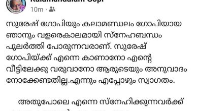 തൃശൂര്: എന്ഡിഎ സ്ഥാനാര്ഥിയും നടനുമായ സുരേഷ് ഗോപിക്ക് എന്നെ കാണാന് ആരുടെയും അനുവാദം വേണ്ടെന്നും എപ്പോഴും സ്വാഗതമെന്നും കഥകളി ആചാര്യന് കലാമണ്ഡലം ഗോപി. സന്ദര്ശനവുമായി ബന്ധപ്പെട്ട വിവാദത്തിനിടെയാണു കലാമണ്ഡലം ഗോപി സമൂഹമാധ്യമത്തില് നിലപാട് വ്യക്തമാക്കിയത്. ”സുരേഷ് ഗോപിയും കലാമണ്ഡലം ഗോപിയായ ഞാനും വളരെക്കാലമായി സ്നേഹബന്ധം പുലര്ത്തി പോരുന്നവരാണ്. സുരേഷ് ഗോപിക്ക് എന്നെ കാണാനോ എന്റെ വീട്ടിലേക്കു വരാനോ ആരുടെയും അനുവാദം നോക്കേണ്ടതില്ല. എന്നും എപ്പോഴും സ്വാഗതം. അതുപോലെ എന്നെ സ്നേഹിക്കുന്നവര്ക്ക് എന്നെ കാണാന് എപ്പോഴും വരാം” കലാമണ്ഡലം ഗോപി കുറിപ്പില് വ്യക്തമാക്കി. കലാമണ്ഡലം ഗോപിയുടെ അനുഗ്രഹം തേടാന് സുരേഷ് ഗോപി വീട്ടിലേക്കുവരാന് ആഗ്രഹിക്കുന്നതായി പ്രശസ്ത ഡോക്ടര് വിളിച്ചുപറഞ്ഞെന്നും വരേണ്ടെന്നു പറഞ്ഞപ്പോള് ‘ആശാനു പത്മഭൂഷണ് കിട്ടണ്ടേ’ എന്നു ചോദിച്ചെന്നും ഗോപിയുടെ മകന് രഘു ഗുരുകൃപ സമൂഹമാധ്യമത്തില് എഴുതിയത് വന് ചര്ച്ചയായിരുന്നു. ‘അങ്ങനെ എനിക്ക് പത്മഭൂഷണ് വേണ്ട’ എന്നു കലാമണ്ഡലം ഗോപി മറുപടി നല്കിയെന്നും ആ ഗോപിയല്ല ഈ ഗോപിയെന്നു മനസ്സിലാക്കണമെന്നും രഘു പറഞ്ഞു.…