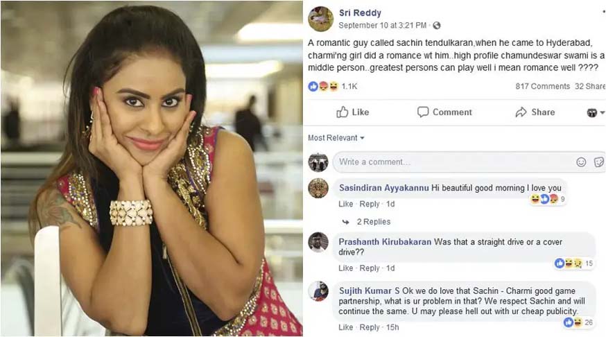 വര്ഷങ്ങള്ക്കു മുന്പ് ശ്രീ റെഡ്ഡി ിഇന്ത്യയുടെ അഭിമാനമായ സച്ചിനെക്കുറിച്ചും മലയാളികള്ക്ക് സുപരിചിതയായ നടിച്ച് നടി ചാര്മിയെ കുറിച്ചും പറഞ്ഞുകൊണ്ട് ഇട്ട ഒരു ഫേസ്ബുക്ക് പോസ്റ്റ് ആണ് ഇപ്പോള് ശ്രദ്ധ നേടുന്നത്. സച്ചിന് ടെണ്ടുല്ക്കര് ഹൈദരാബാദിലെത്തിയാല് ഒരുപാട് റൊമാന്റിക് ആവാറുണ്ട് എന്നും നടി ചാര്മിയുമായി ആണ് ആ റൊമാന്സ് എന്നും ആയിരുന്നു ശ്രീ റെഡ്ഡി തന്റെ ഫേസ്ബുക്കിലൂടെ കുറിച്ചത്. ആ സമയത്ത് വലിയ തോതില് തന്നെ ഈ ഒരു വാര്ത്ത ശ്രദ്ധ നേടുകയും എത്തുകയും ചെയ്തിരുന്നു.