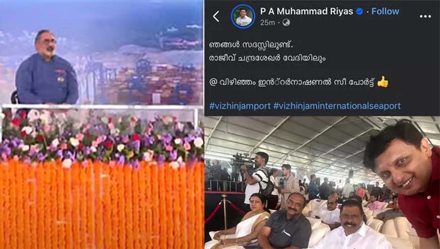 തിരുവനന്തപുരം: വിഴിഞ്ഞം തുറമുഖ പദ്ധതിയുടെ ക്രെഡിറ്റിനെ ചൊല്ലിയുള്ള വിവാദം അവസാന നിമിഷവും തുടരുന്നു. ഉദ്ഘാടന വേദിയിലും വിവാദം തുടരുകയാണ്. മുന് മന്ത്രി രാജീവ് ചന്ദ്രശേഖറിനെ പദ്ധതിയുടെ സമര്പ്പണ വേദിയില് ക്ഷണം ഉണ്ടായിരുന്നു. ഇത് പ്രകാരം അദ്ദേഹ നേരത്തെ വേദിയിലെത്തി ഇറുപ്പുറപ്പിച്ചു. ബിജെപി അണികള് ആവേശത്തോടെ മുദ്രാവാക്യം വിളിച്ചപ്പോള് രാജീവും അതേറ്റു വിളിച്ചു. എന്നാല്, ഇത് കണ്ട മന്ത്രി മുഹമ്മദ് റിയാസിന് ശരിക്കും അസ്വസ്തനായി.