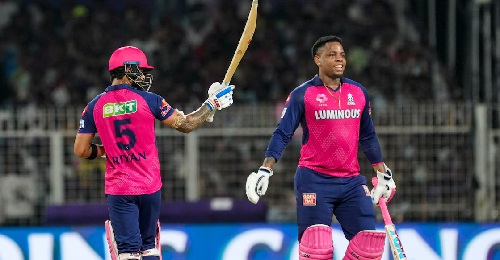 ഒരു ഘട്ടത്തിൽ അഞ്ചിന് 71 റൺസെന്ന നിലയിൽ തകർന്ന രാജസ്ഥാനെ, ആറാം വിക്കറ്റിൽ ഹെറ്റ്മെയറിനെ കൂട്ടുപിടിച്ച് റിയാൻ പരാഗ് നടത്തി കടന്നാക്രമണമാണ് രക്ഷപ്പെടുത്തിയത്. 48 പന്തിൽ ഇരുവരും ചേർന്ന് രാജസ്ഥാൻ സ്കോർ ബോർഡിലെത്തിച്ചത് 92 റൺസാണ്. ആറാം വിക്കറ്റിൽ ഇത് രാജസ്ഥാന്റെ റെക്കോർഡ് കൂട്ടുകെട്ടാണ്. ഷിമ്രോൺ ഹെറ്റ്മെയർ 23 പന്തിൽ ഓരോ സിക്സും ഫോറും സഹിതം 29 റൺസെടുത്തു. ഹർഷിത് റാണയുടെ പന്തിൽ സുനിൽ നരെയ്ന് ക്യാച്ച് സമ്മാനിച്ചാണ് ഹെറ്റ്മെയർ മടങ്ങിയത്.