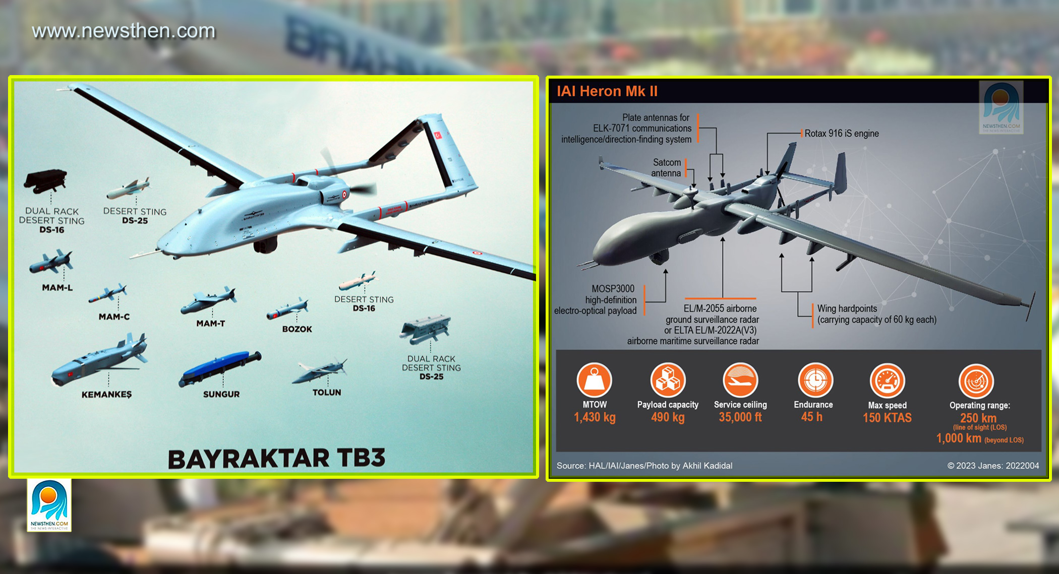 അതുപോലെതന്നെ ഇന്ത്യ ഇസ്രായേലിന്റെ യുദ്ധ ഡ്രോണുകളായ ഹീറോണ് മാര്ക്ക് 2 വിന് ഒപ്പം അമേരിക്കയുടെ ഡ്രോണുകളും സ്വന്തമാക്കിയിട്ടുണ്ട്. ഈ സമയം പാകിസ്താന് തുര്ക്കിയുടെ ബെയ്റാക്തര് ടിബി 2 ഡ്രോണുകള് നേടിയിട്ടുണ്ട്. യുക്രൈന് റഷ്യക്കെതിരായ യുദ്ധത്തില് ഇതാണ് ഉപയോഗിക്കുന്നത്. എയ്കിന്സി എന്ന മറ്റൊരു തുര്ക്കിഷ് ഡ്രോണുകളും പാകിസ്താന്റെ പക്കലുണ്ടെന്നു പാകിസ്താനി സുരക്ഷാ ഉദ്യോഗസ്ഥനെ ഉദ്ധരിച്ച് റോയിട്ടേഴ്സ് ചൂണ്ടിക്കാട്ടുന്നു.