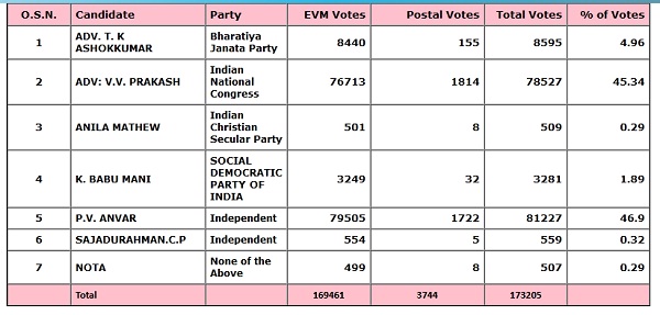 2021ല് നടന്ന തെരഞ്ഞെടുപ്പില് 1700 വോട്ടിന്റെ മാത്രം ഭൂരിപക്ഷത്തിലാണ് അന്വറിന്റെ വിജയം. എതിരാളിയായ അഡ്വ. വി.വി. പ്രകാശിന് 78527 വോട്ട് ലഭിച്ചു. ബിജെപിക്ക് 8595 വോട്ടുകളും ലഭിച്ചു. ഇന്ത്യന് ക്രിസ്ത്യന് സെക്കുലര് പാര്ട്ടി സ്ഥാനാര്ഥിയായിരുന്ന അനില് മാത്യുവിന് 509 വോട്ടുകള് മാത്രമാണു ലഭിച്ചത്. എസ്ഡിപിഐ സ്ഥാനാര്ഥി കെ. ബാബു മണിക്ക് 3281 വോട്ടുകളും മറ്റൊരു സ്വതന്ത്രന് 559 വോട്ടും നോട്ടയ്ക്ക് 507 വോട്ടും ലഭിച്ചു. ഇക്കുറി എസ്ഡിപിഐ പിന്തുണ യുഡിഎഫിന് ആയതിനാല് ഈ വോട്ട് നിര്ണായകമാകും. ക്രിസ്ത്യന് പ്രീണനത്തിന്റെ ഭാഗമായി സ്ഥാനാര്ഥിയാക്കിയാല് വി.എസ്. ജോയിക്കു ലഭിക്കാന് സാധ്യത കുറവാണ്.