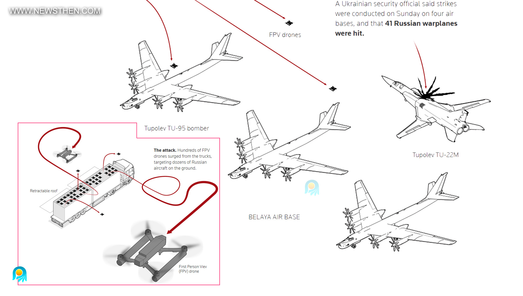 റഷ്യന് എയര്ബേസുകള്ക്കു സമീപമെത്തിയപ്പോള് ട്രക്കുകള് എവിടെ നിര്ത്തണമെന്നു ഡ്രൈവര്മാര്ക്കു ഫോണിലൂടെ നിര്ദേശം നല്കി. ഇതിലൊരു ട്രക്ക് നിര്ത്തിയപ്പോള്തന്നെ കണ്ടെയ്നറിന്റെ മുകള്ത്തട്ടില് തടികൊണ്ടുള്ള ഭാഗം തുറക്കുകയും ഡ്രോണുകള് ഉയര്ന്നു പൊങ്ങുകയുമായിരുന്നു. മറ്റൊതു ട്രക്ക് സഞ്ചരിക്കുന്നതിനിടയിലും ഡ്രോണുകള് പറന്നു. പി 255 ഹൈവേയില് പാര്ക്ക് ചെയ്ത ട്രക്കില്നിന്നാണ് ഏഴു കിലോമീറ്റര് മാത്രം അകലെയുള്ള ബെലായ എയര്ബേസിലേക്കു ഡ്രോണുകള് പറന്നത്.