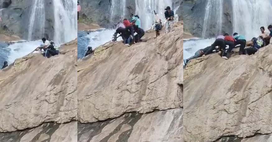 കൂടെ എത്തിയവര് ബഹളം വച്ചതോടെ നാട്ടുകാര് രക്ഷാപ്രവര്ത്തനത്തിനായി എത്തി. യുവാവിന്റെ ശരീരത്തില് കയര് കെട്ടി വലിച്ച് കയറ്റി. യുവാവ് തങ്ങി നിന്നതിനു താഴെ വലിയ രണ്ട് കയങ്ങളാണ്.