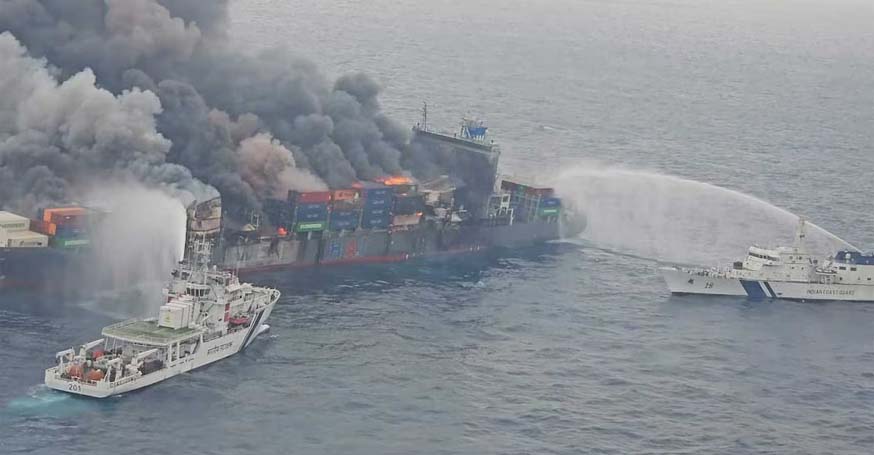 കപ്പലില് അപകടരമായ രാസവസ്തുക്കള് അടക്കം ഉണ്ടെന്ന റിപ്പോര്ട്ടുകള് പുറത്തു വരുന്നതിനിടെ കപ്പല് മുങ്ങുന്ന സാഹചര്യമുണ്ടാകുമോ എന്നതാണ് ആശങ്ക പടര്ത്തിയിരിക്കുന്നത്. കപ്പലിലെ കണ്ടെയ്നറുകളിലേക്കും ഇന്നലെ തന്നെ തീ പടര്ന്നിരുന്നു. കപ്പലിന്റെ മധ്യത്തിനു കുറച്ചു മുമ്പായി പടര്ന്നു തുടങ്ങിയ തീ പിന്നീട് കപ്പല് ആകെ വ്യാപിക്കുകയായിരുന്നു. കൊളംബോ തുറമുഖത്തു നിന്ന് മുംബൈയിലെ ജവഹര്ലാല നെഹ്റു തുറമുഖത്തേക്ക് പോവുകയായിരുന്നു സിംഗപ്പുര് പതാക പേറുന്ന കപ്പല്. കപ്പലിലെ 18 പേര് രക്ഷപെട്ടെങ്കിലും ഇതില് 2 പേര്ക്ക് ഗുരുതരമായി പൊള്ളലേറ്റിരുന്നു. കപ്പലിലെ തീ അണയ്ക്കാനുള്ള ശ്രമങ്ങള്ക്കിടെ കാണാതായ 4 പേരെ കണ്ടെത്താനുള്ള ശ്രമങ്ങള് ഇപ്പോഴും തുടരുകയാണ്.