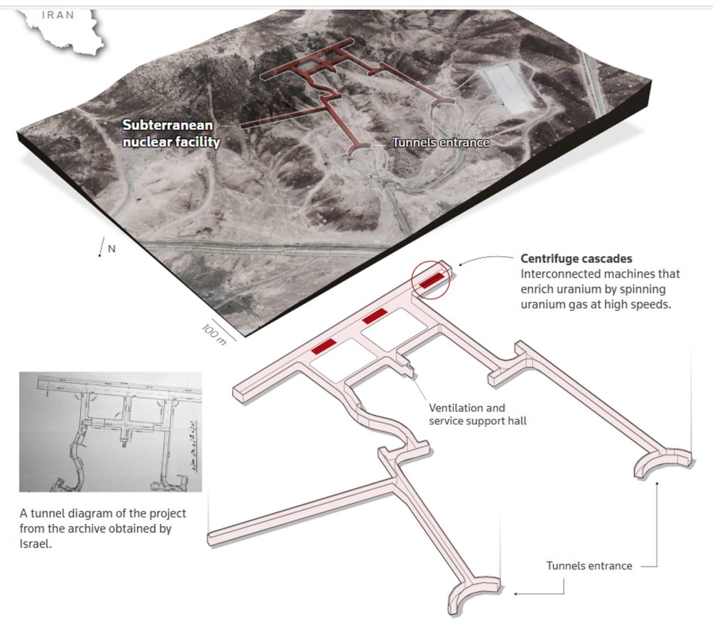പര്വതത്തിന്റെ ആഴങ്ങളിലേക്കു കുഴിച്ചുണ്ടാക്കിയ നിലയത്തിലേക്ക് ഇറാന് ആക്രമണം അഴിച്ചുവിടാന് കഴിഞ്ഞിട്ടില്ലെങ്കിലും അതിന്റെ ഭൂപടമടക്കം ഇസ്രയേലിനു മനപാഠമാണ് എന്നതാണു പ്രധാനം. കാരണം, മുമ്പ് ആണവരേഖകള് ഇസ്രയേല് അടിച്ചുമാറ്റിയപ്പോള് ഫോര്ദോയിലെ ടണലുകളുടെ പ്ലാനും സെന്ട്രിഫ്യൂജ് കാസ്കേഡുകളുടെയും സ്ഥാനമടക്കം അവര്ക്കു ലഭിച്ചിരുന്നു.