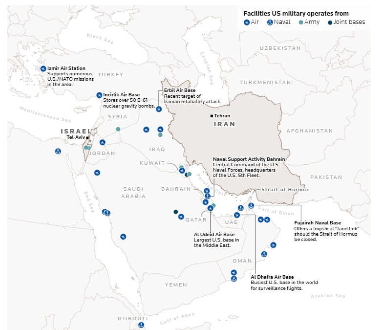 വ്യോമാക്രമണങ്ങളില് അമേരിക്ക നേരിട്ടു പങ്കാളിയാകുന്നതിന്റെ ഭാഗമായി പശ്ചിമേഷ്യന് രാജ്യങ്ങളിലെല്ലാമുള്ള നിരവധി താവളങ്ങളിലെല്ലാം ഒരുക്കങ്ങളാരംഭിക്കാനാണു നിര്ദേശം നല്കിയിരിക്കുന്നത്. ഇവയെയെല്ലാം ഇറാനും തിരിച്ചടിയുടെ ഭാഗമായി ആക്രമിക്കുമെന്ന ഭീതിയുമുണ്ട്. ഇറാന്റെ മിസൈലുകള് സൈനിക താവളങ്ങളില് മാത്രമാകില്ല പതിക്കുക. പകരം, ഇറാഖ്, കുവൈത്ത്, ഖത്തര്, യുഎഇ, സൗദി അറേബ്യ എന്നിവിടങ്ങളിലുള്ള ഒന്നിലേറെ താവങ്ങള്ക്കരികിലുള്ള ജനവാസ മേഖലകളിലും പതിക്കാന് സാധ്യതയുള്ളതിനാല് പശ്ചിമേഷ്യയായെ ട്രംപിന്റെ പ്രഖ്യാപനത്തിനു പിന്നാലെ കടുത്ത യുദ്ധ ഭീതിയിലാണ്.