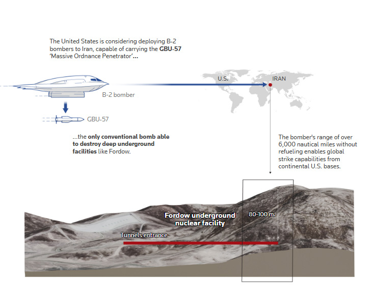 ഫോര്ദോയ്ക്ക് മേല് മുഴുവന് പ്രഹരശേഷിയോടെയുമാണ് ബോംബിട്ടതെന്നായിരുന്നു ട്രംപിന്റെ വെളിപ്പെടുത്തല്. ബി2 സ്റ്റെല്ത്ത് ബോംബറുകളാണ് ആക്രമണത്തിനായി ഉപയോഗിച്ചതെങ്കിലും അതിലേത് തരം ബോംബാണ് പ്രയോഗിച്ചതെന്ന് ട്രംപ് വെളിപ്പെടുത്തിയില്ല. ഇസ്രയേലിന്റെ സമ്മര്ദത്തിന് വഴങ്ങിയാണ് യുഎസ് ഫോര്ഡോ ആക്രമിക്കാനെത്തിയത്. ജിബിയു-57 എന്ന അമേരിക്കയുടെ ബങ്കര് ബസ്റ്റര് ബോംബ് അതിന്റെ മുഴുവന് ഭാരത്തോടെയും ഗതികോര്ജത്തോടെയും ഭൂമിയിലേക്ക് ഇറങ്ങിയ ശേഷം ലക്ഷ്യത്തിലെത്തി പൊട്ടിത്തെറിക്കുകയാണ് ചെയ്യുന്നത്. അമേരിക്കയുടെ കൈവശം മാത്രമാണ് നിലവില് ഇതുള്ളത്. ഇതാദ്യമായാണ് അമേരിക്ക പ്രയോഗിക്കുന്നതും. ഭൗമോപരിതലത്തില് നിന്നും 200 അടി (60 മീറ്റര്)വരെ താഴെ എത്തിയ ശേഷം പൊട്ടിത്തെറിക്കുന്ന ഇവ ഒന്നിന് പിന്നാലെ ഒന്നായി വിക്ഷേപിച്ചാല് മാരക പ്രഹരമായിരിക്കും ഏല്ക്കുകയെന്നും റിപ്പോര്ട്ടുകളുണ്ട്.