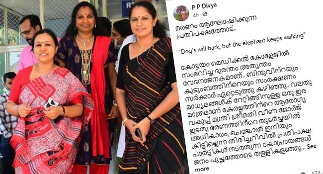 അതുപോലെ കെട്ടിടം തകർന്നു വീണു എന്ന് കേട്ടപ്പാടെ മാധ്യമങ്ങൾക് മുന്നിൽ നടത്തിയ ചാണ്ടി ഷോ അൽപ സമയം നിർത്തി വെച്ച് ദുരന്ത നിവാരണ പ്രവർത്തനങ്ങൾക്ക് അങ്ങയ്ക്കു നേതൃത്വം കൊടുക്കാൻ പാടില്ലായിരുന്നോ… എന്നും പിപി ദിവ്യ ചോദിക്കുന്നു. മന്ത്രി വീണാ ജോർജിനൊപ്പമുള്ള ചിത്രം സഹിതമായിരുന്നു ദിവ്യയുടെ കുറിപ്പ്.