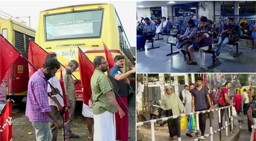 കെഎസ്ആര്ടിസി അടക്കം സര്വീസ് നടത്താതിരുന്നതോടെയാണ് റെയില്വേ സ്റ്റേഷനിലടക്കം വന്നിറങ്ങിയ യാത്രക്കാര് പെരുവഴിയിലായത്. പല ബസ് സ്റ്റാന്റുകളിലും യാത്രക്കാര് കാത്തുകിടക്കുകയാണ്. എറണാകുളത്ത് കെഎസ്ആര്ടിസി ഡിപ്പോയില് നിന്നും കോഴിക്കോട്ടേക്ക് പുറപ്പെട്ട ബസ് സമരക്കാര് തടഞ്ഞു. പൊലീസ് സംരക്ഷണമില്ലാത്തതിനാല് ബസ് എടുക്കാനാകില്ലെന്നും പൊലീസ് സംരക്ഷണം അനുവദിക്കുമെങ്കില് സര്വീസ് നടത്താമെന്നും ജീവനക്കാര് അറിയിച്ചു.