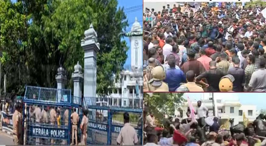 ഈ സമയത്താണ് എഐഎസ്എഫ് പ്രവര്ത്തകര് യൂണിവേഴ്സിറ്റിക്കുള്ളില് പ്രതിഷേധം സംഘടിപ്പിച്ചത്. കെട്ടിടത്തിനുള്ളിലേക്ക് കടക്കാന് ശ്രമിച്ച പ്രവര്ത്തകരെ പോലീസ് ബലംപ്രയോഗിച്ച് അറസ്റ്റുചെയ്ത് നീക്കി. ഇതിനുപിന്നാലെയാണ് ഡിവൈഎഫ്ഐ പ്രവര്ത്തകര് പ്രതിഷേധവുമായി യൂണിവേഴ്സിറ്റിക്ക് മുന്നില് എത്തിയത്. ബാരിക്കേഡ് ഉപയോഗിച്ച് അടച്ചിരുന്ന ഗേറ്റ് തകര്ത്ത് പ്രവര്ത്തകര് ഉള്ളിലേക്ക് കടക്കാന് ശ്രമിച്ചതോടെ പോലീസ് ജലപീരങ്കി പ്രയോഗിച്ചു.