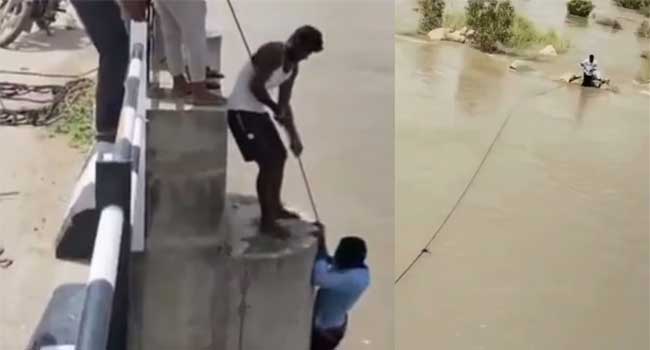 నదిలో కొట్టుకుపోతూ రాయి వద్ద చిక్కుకున్న భర్త.. తాడు సహాయంతో కాపాడిన స్థానికులు