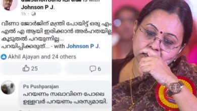 പത്തനംതിട്ട: കോട്ടയം മെഡിക്കല് കോളേജ് സംഭവത്തിനുപിന്നാലെ മന്ത്രി വീണാ ജോര്ജിനെതിരെ സിപിഎം ലോക്കല് കമ്മിറ്റി അംഗം. വീണാ ജോര്ജിന് എംഎല്എ ആയി ഇരിക്കാന് പോലും അര്ഹതയില്ലെന്ന് പത്തനംതിട്ട ഇലന്തൂര് ലോക്കല് കമ്മിറ്റി അംഗം ജോണ്സണ് പിജെ ഫെയ്സ്ബുക്കില് കുറിച്ചു. എസ്എഫ്ഐ മുന് ജില്ലാ പ്രസിഡന്റ് കൂടിയാണ് ജോണ്സണ്. ‘വീണാ ജോര്ജിന് മന്ത്രി പോയിട്ട് ഒരു എംഎല്എ ആയിരിക്കാന് അര്ഹതയില്ല. കൂടുതല് പറയുന്നില്ല… പറയിപ്പിക്കരുത്.’ ജോണ്സണ് ഫെയ്സ്ബുക്കില് കുറിച്ചു. പ്രതിപക്ഷത്തുനിന്നുമാത്രമല്ല പാര്ട്ടിക്കുള്ളില് നിന്നുതന്നെ പരസ്യമായി മന്ത്രിക്കെതിരെ വിമര്ശനം ശക്തമായിരിക്കുകയാണ്. മന്ത്രി വീണാ ജോര്ജ് ആശുപത്രിയില് ചികിത്സതേടിയതിനെ പുറത്താക്കപ്പെട്ട പത്തനംതിട്ട സിഡബ്ല്യുസി ചെയര്മാന് പരോക്ഷമായി പരിഹസിച്ചു. മന്ത്രിയുടെ മണ്ഡലത്തില്പ്പെട്ട ഇരവിപേരൂര് സിപിഎം ഏരിയാ കമ്മിറ്റിയംഗംകൂടിയായ എന്. രാജീവാണ് ഫെയ്സ്ബുക്ക് പോസ്റ്റിട്ടത്. കുട്ടിയായിരിക്കെ താന് ക്ലാസ് പരീക്ഷാദിവസം വയറുവേദന എന്ന കളവുപറഞ്ഞ് വീട്ടില് ഇരിക്കുമായിരുന്നു. അങ്ങനെ പരീക്ഷകളില്നിന്ന് രക്ഷപ്പെട്ടു. ഇവിടെ ചോദ്യങ്ങളില്നിന്നും. കൊടുത്താല് എവിടെ വേണമെങ്കിലും കിട്ടും എന്നും പോസ്റ്റില് പറയുന്നു. അഡ്വക്കേറ്റ് പ്രതിയായ പത്തനംതിട്ട…