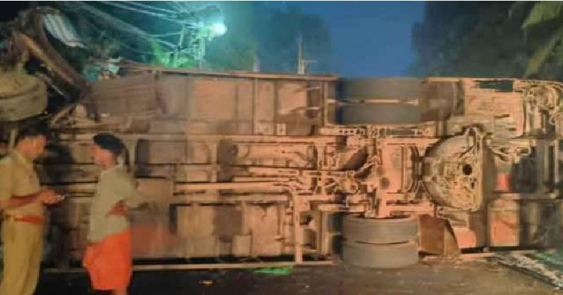 മരത്തിലും കാറിലും ഇടിച്ച ശേഷം നടുറോഡിന് കുറുകെയാണ് ബസ് മറിഞ്ഞത്.