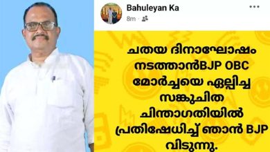 തിരുവനന്തപുരം: ചതയ ദിനാഘോഷത്തെ ചൊല്ലി ബിജെപിയില് പൊട്ടിത്തെറി. ദേശീയ കൗണ്സില് അംഗം കെ ബാഹുലേയന് ബിജെപി വിട്ടു. ഒബിസി മോര്ച്ചയെ ചതയ ദിനാഘോഷത്തിന് നിയോഗിച്ചതില് ആണ് പ്രതിഷേധം. എസ്എന്ഡിപി യോഗം അസിസ്റ്റന്റ് സെക്രട്ടറിയാണ് ബാഹുലേയന്. ഫേസ്ബുക്ക് പോസ്റ്റിലൂടെയായിരുന്നു രാജി പ്രഖ്യാപനം. ശ്രീനാരായണഗുരു ജയന്തി നടത്തേണ്ടത് ഈഴവര് മാത്രമല്ലെന്ന് പ്രബല വിഭാഗം പറഞ്ഞു. കഴിഞ്ഞ ദിവസം സംസ്ഥാന നേതൃത്വത്തിന്റെ തീരുമാനത്തിനെതിരെ ടി.പി സെന്കുമാര് ഐഎഎസ് രംഗത്തെത്തിയിരുന്നു. എസ്എന്ഡിപി യോഗം അസിസ്റ്റന്റ് സെക്രട്ടറിയാണ് ബാഹുലേയന്. ചതയ ദിനാഘോഷം നടത്താന് ബിജെപി ഒബിസി മോര്ച്ചയെ ഏല്പ്പിച്ച സങ്കുചിത ചിന്താഗതിയില് പ്രതിഷേധിച്ച് ഞാന് ബിജെപി വിടുന്നു എന്നായിരുന്നു ബാഹുലേയന്റെ ഫേസ്ബുക്ക് പോസ്റ്റ്.