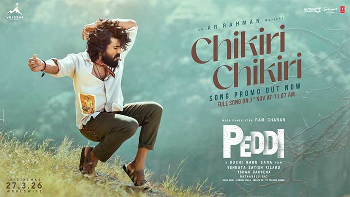 ഹൈദരാബാദ്: തെലുങ്ക് സൂപ്പർതാരം രാം ചരൺ നായകനായി അഭിനയിക്കുന്ന പാൻ ഇന്ത്യൻ ചിത്രമായ ‘പെദ്ധി’യിലേ ഏറ്റവും പുതിയ ഗാനമായ “ചികിരി ചികിരി” യുടെ പ്രോമോ പുറത്ത്. ഗാനത്തിൻ്റെ പൂർണ്ണ രൂപം നവംബർ 7 ന് രാവിലെ 11.07 ന് പുറത്ത് വരും. ഓസ്കാർ അവാർഡ് ജേതാവ് എ ആർ റഹ്മാൻ സംഗീതം പകർന്ന ഗാനം ആലപിച്ചത് മോഹിത് ചൗഹാൻ ആണ്. ദേശീയ അവാർഡ് ജേതാവ് ബുചി ബാബു സന സംവിധാനം ചെയ്യുന്ന ചിത്രത്തിന്റെ ആഗോള റിലീസ്, മാർച്ച് 27, 2026 നാണ്. വൃദ്ധി സിനിമാസിൻ്റെ ബാനറിൽ വെങ്കട സതീഷ് കിലാരു ആണ് ചിത്രം നിർമ്മിക്കുന്നത്. മൈത്രി മൂവി മേക്കർസ്, സുകുമാർ റൈറ്റിങ്സ് എന്നിവർ ചേർന്നാണ് ഈ ബിഗ് ബഡ്ജറ്റ് ചിത്രം അവതരിപ്പിക്കുന്നത്.