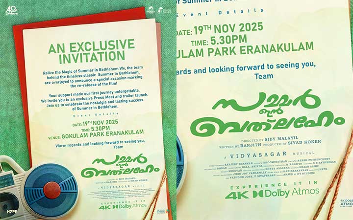 ഈ ക്രിസ്മസിന് ഡെന്നീസിന്റെ ബത്ലഹേം കാണാൻ വീണ്ടും ഒരുങ്ങി സിബി മലയിൽ – രഞ്ജിത്ത് കൂട്ടുകെട്ടിലൊരുങ്ങിയ *”സമ്മർ ഇൻ ബത്ലഹേം”* ഡിസംബർ 12ന് 4K ദൃശ്യമികവോടെ തിയേറ്ററുകളിലെത്തും.രഞ്ജിത്തിന്റെ തിരക്കഥയിൽ സിയാദ് കോക്കർ നിർമിച്ച് സിബി മലയിലാണ് ചിത്രം സംവിധാനം ചെയ്ത ചിത്രം, കോക്കേഴ്സ് ഫിലിംസിനോടൊപ്പം അഞ്ജന ടാക്കീസ്, എവരിഡേ ഫിലിംസ് എന്നിവരുമായി സഹകരിച്ച് കൊണ്ടാണ് വീണ്ടും തിയേറ്ററുകളിൽ എത്തിക്കുന്നത്….
