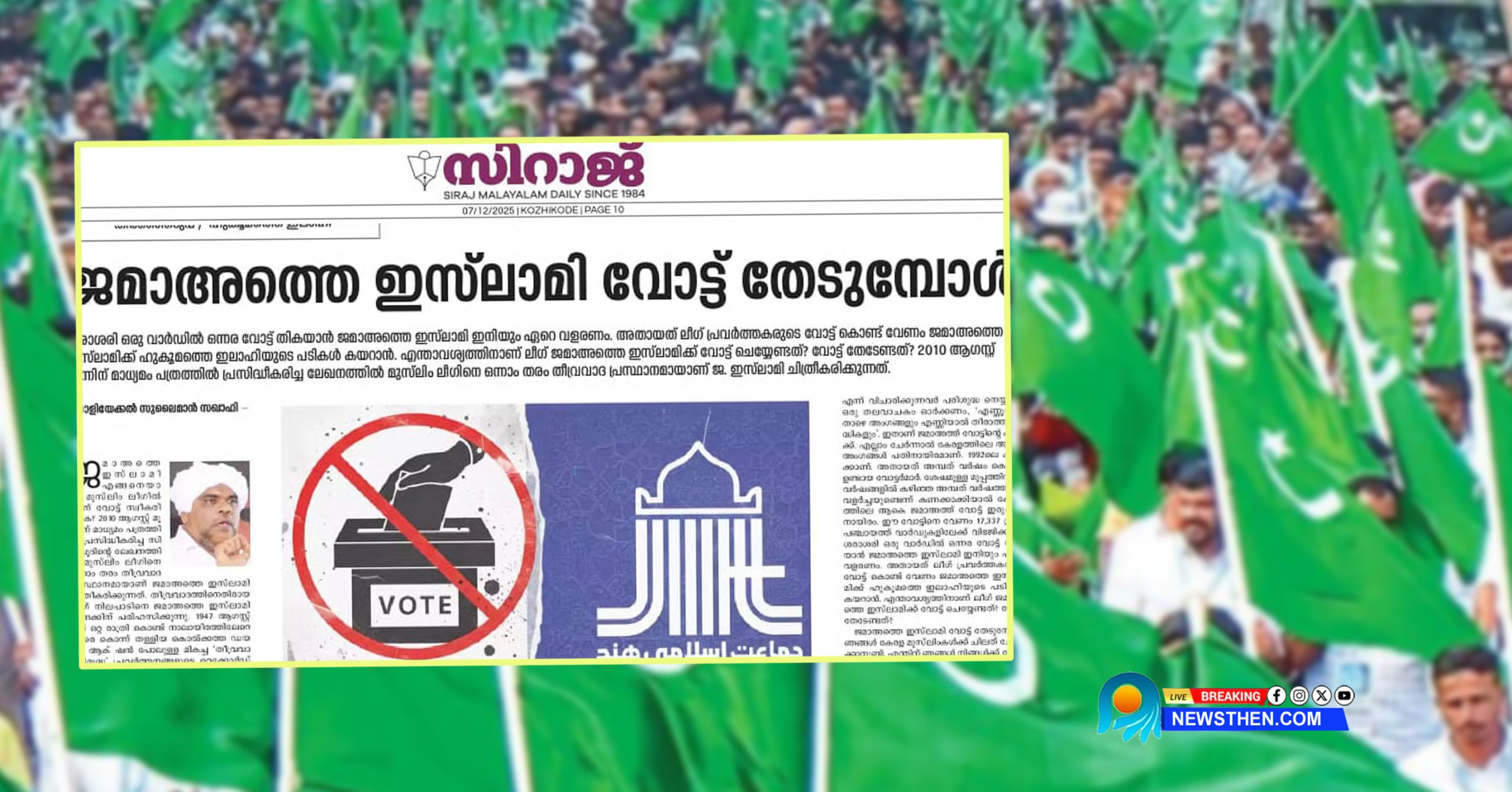 കഴിഞ്ഞ മുപ്പതിലധികം വര്ഷങ്ങള് നിരന്തരം സമുദായത്തിന് പേരുദോഷമുണ്ടാക്കിയ ജമാഅത്തെ ഇസ്ലാമിക്കും അതിന്റെ രാഷ്ട്രീയ മുഖമായ വെല്ഫെയര് പാര്ട്ടിക്കുമാണോ ലീഗ് പ്രവര്ത്തകര് വോട്ട് ചെയ്യേണ്ടത്? സമുദായത്തിന്റെ കള്ളിയില് നഷ്ടങ്ങളുടെ കണക്ക് മാത്രം എഴുതിച്ചേര്ത്ത മൗദൂദികള്ക്ക് ലീഗ് പ്രവര്ത്തകര് എങ്ങനെ വോട്ട് ചെയ്യും? ജമാഅത്ത് വോട്ടുകള് കൊണ്ട് മറിച്ച് കളയാം എന്ന് വിചാരിക്കുന്നവര് പരിശുദ്ധ നെയ്യിലെ ഒരു തലവാചകം ഓര്ക്കണം, ”എണ്ണൂറില് താഴെ അംഗങ്ങളും എണ്ണിയാല് തീരാത്ത സിദ്ധികളും’. ഇതാണ് ജമാഅത്ത് വോട്ടിന്റെ കണക്ക്.