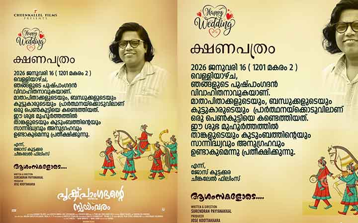 ജോസ് കൂട്ടക്കര നിർമ്മിച്ച് സുരേന്ദ്രൻ പയ്യാനക്കൽ തിരക്കഥ എഴുതി സംവിധാനം ചെയ്യുന്ന ഏറ്റവും പുതിയ ചിത്രമായ “പുഷ്പാംഗദന്റെ ഒന്നാം സ്വയംവരം ” ജനുവരി 16 മുതൽ കേരളത്തിലെ തീയേറ്ററുകളിൽ പ്രദർശനത്തിന് എത്തുന്നു. ഉണ്ണിരാജ, സി.എം ജോസ് എന്നിവരാണ് ചിത്രത്തിൽ പ്രധാന വേഷങ്ങൾ അവതരിപ്പിക്കുന്നത്. ഹാസ്യത്തിന്റെ രസക്കൂട്ടുകൾ ചാലിച്ച് അവതരിപ്പിക്കുന്ന ഈ ചിത്രത്തിന്റെ മനോഹരമായ കല്യാണക്കുറി പോലുള്ള പോസ്റ്ററാണ് ഇപ്പോൾ സോഷ്യൽ മീഡിയയിൽ വൈറലാകുന്നത്.വയനാട്ടിലെ കാപ്പി കർഷകനും ഫ്ലോർമിൽ ഉടമസ്ഥനുമായ 40ത് കഴിഞ്ഞ പുഷ്പാംഗദന്റെ ഏറേ നാളത്തെ വിവാഹാലോചനകൾക്കു ശേഷം ഒടുവിൽ സുന്ദരിയായ ഒരു പെൺകുട്ടിയെ കണ്ടെത്തുന്നു.