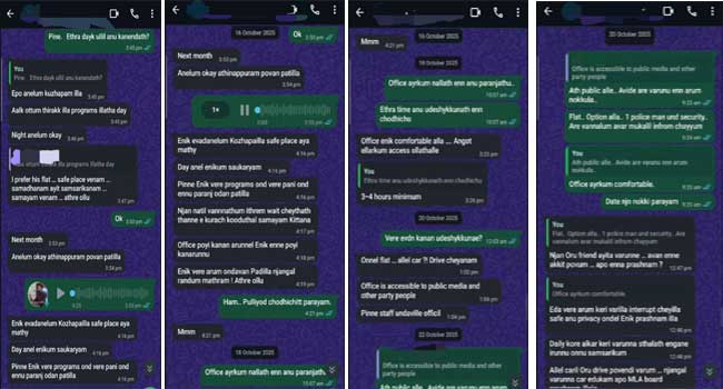 2024 ഏപ്രിലിൽ ബലാത്സംഗം ചെയ്തു എന്ന് അവർ പറയുന്ന ആളിനെ, 2025 ഒക്ടോബറിൽ ” I prefer his flat , safe place, night aayalum kuzhappamilla” എന്നു അവർ പറഞ്ഞതിൻ്റെ തെളിവുകൾ എൻ്റെ കയ്യിലുണ്ട്. അങ്ങനെ അവർ പറഞ്ഞത് അറിയാവുന്നത് കൊണ്ടാണ് അവർ ബലാത്സംഗ പരാതി പറഞ്ഞത് അത്ഭുതപ്പെടുത്തി എന്ന് ഞാൻ പറഞ്ഞത്. 2024ൽ മൂന്ന് മണിക്കൂർ ബലാത്സംഗം ചെയ്ത ആളെ 2025 ഒക്ടോബറിൽ അതേ മൂന്ന് മണിക്കൂർ ഒറ്റയ്ക്ക് കാണണം എന്ന് പറയുന്നതിൻ്റെ ലോജിക് എന്താണ് ?