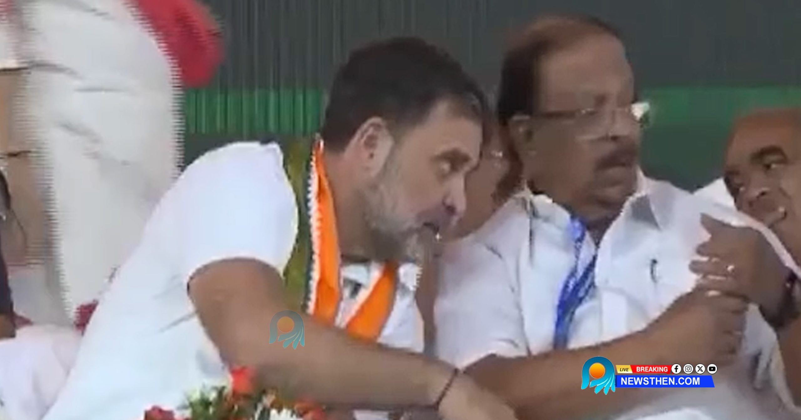 രാഹുല്ഗാന്ധി വേദിയിലെത്തുന്നതുമുതല് കസേരയില് ഇരിക്കുന്നതുവരെയുള്ള ദൃശ്യങ്ങളാണ് പുറത്തുവന്നത്. വേദിയിലേക്ക് എത്തിയ രാഹുല് എം.എം. ഹസന്, കെ. മുരളീധരന്, ബെന്നി ബെഹനാന്, കൊടിക്കുന്നില് സുരേഷ്, അടൂര് പ്രകാശ്, വി.എസ്. ശിവകുമാര്, ദീപ്തി മേരി വര്ഗീസ് എന്നിവര്ക്കും അദ്ദേഹം കൈകൊടുത്തു. തൊഴുതു നില്ക്കുന്ന കെ. സുധാകരനെ കണ്ടതോടെ അതുവരെ നേതാക്കള്ക്ക് അരികിലേക്ക് എത്തിയ രാഹുല് സ്വച്ചിട്ടതുപോലെ നിന്നു. പിന്നെ തിരിഞ്ഞു നടന്നു.