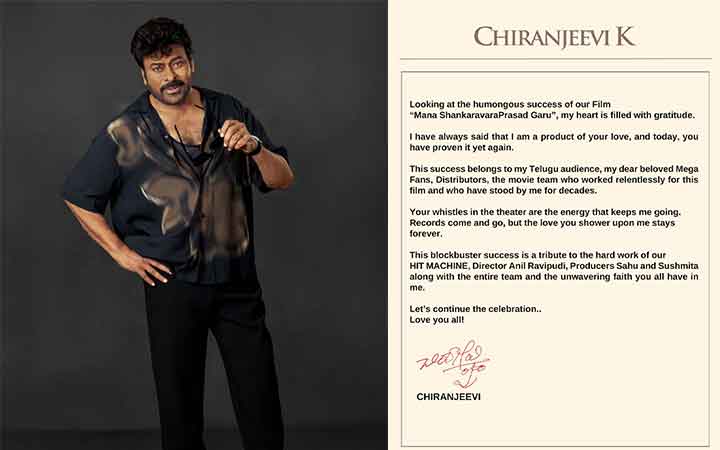 ചിത്രം ബോക്സ് ഓഫീസിൽ തരംഗങ്ങൾ സൃഷ്ടിക്കുകയും ഉത്സവ സീസണിന് ഊർജ്ജം പകരുകയും ചെയ്യുന്ന സമയത്ത്, ചിത്രം നേടുന്ന കളക്ഷനെക്കാളും, ഈ വിജയത്തിന് പിന്നിലുള്ള ശ്കതിയായ തന്റെ ആരാധകരെയും വിതരണക്കാരെയും കഠിനാധ്വാനികളായ ടീമിനെയും കുറിച്ചു സംസാരിക്കാനാണ് ചിരഞ്ജീവി തീരുമാനിച്ചത്. തന്റെ ഹൃദയംഗമമായ കുറിപ്പിൽ, “മന ശങ്കര വര പ്രസാദ് ഗാരു” വിനെ ഈ നിമിഷത്തിലേക്ക് കൊണ്ടുവന്ന യാത്രയെക്കുറിച്ച് അദ്ദേഹം ആഴത്തിൽ സംസാരിച്ചു. ഒപ്പം, തന്റെ കരിയറിലെ ഓരോ നാഴികക്കല്ലും ചലച്ചിത്രപ്രേമികളുടെ തലമുറകളുടെ വാത്സല്യത്താൽ രൂപപ്പെട്ടതാണെന്ന് അദ്ദേഹം ആവർത്തിച്ചു വ്യക്തമാക്കി. ഈ സന്ദേശം അദ്ദേഹത്തിന്റെ ആരാധകർക്കിടയിൽ വ്യാപകമായി പ്രതിധ്വനിക്കുന്നു എന്നതിനൊപ്പം, അവർ അദ്ദേഹത്തിന്റെ മഹത്തായ പാരമ്പര്യം ആഘോഷിക്കുന്നതുപോലെ ഈ സിനിമയും ആഘോഷിക്കുന്നു.