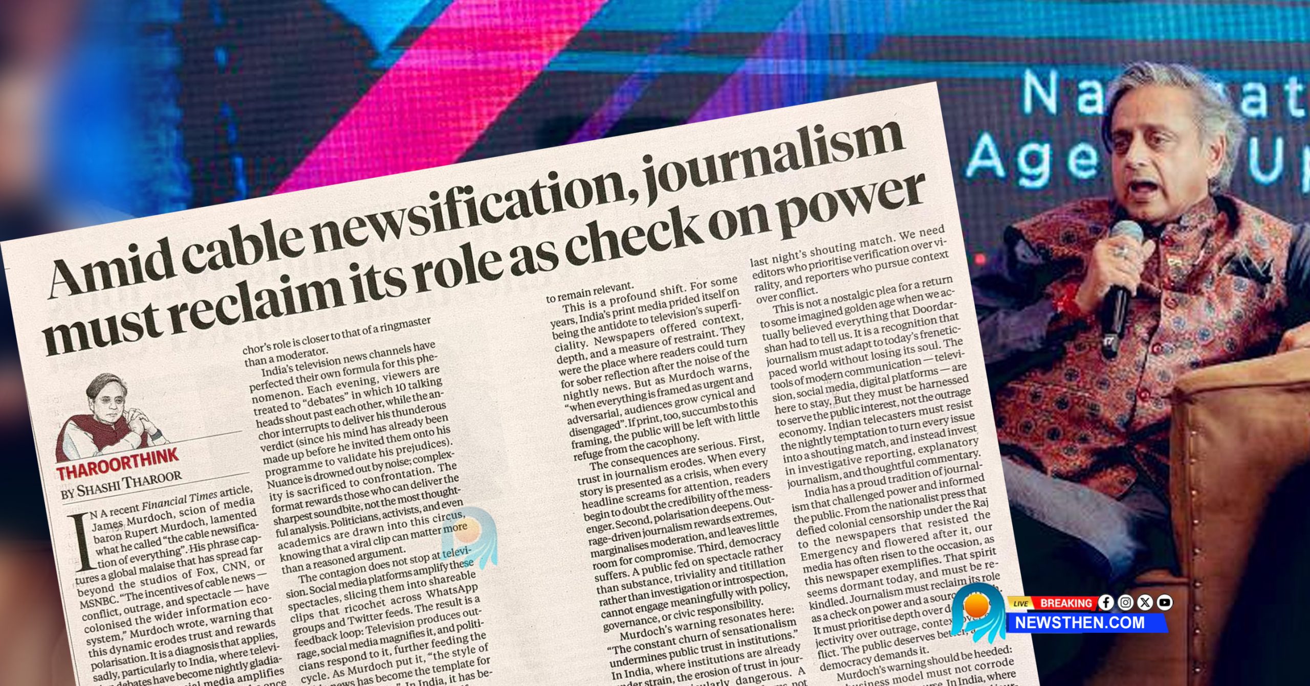പണ്ട് വസ്തുതകളുടെയും ഗൗരവത്തിന്റെയും കോട്ടയായിരുന്ന അച്ചടി മാധ്യമങ്ങളും ഈ സമ്മര്‍ദ്ദത്തിന് വഴങ്ങാന്‍ തുടങ്ങിയിരിക്കുന്നു. രാവിലെ പത്രം വായനക്കാരിലേക്ക് എത്തുമ്പോഴേക്കും ടെലിവിഷനിലൂടെ അവര്‍ വിവരങ്ങള്‍ അറിഞ്ഞുകഴിഞ്ഞിരിക്കുമെന്ന് എഡിറ്റര്‍മാര്‍ക്കറിയാം. അതിനാല്‍ വാര്‍ത്തകളെ ചോദ്യം ചെയ്യുന്നതിനുപകരം അതേ ശൈലി പിന്തുടരാന്‍ അവര്‍ പ്രലോഭിതരാകുന്നു. തലക്കെട്ടുകള്‍ കൂടുതല്‍ നാടകീയമാകുന്നു, വിശകലനങ്ങള്‍ പക്ഷപാതപരമാകുന്നു, കൃത്യമായ പരിശോധനകള്‍ പലപ്പോഴും പ്രസക്തി നിലനിര്‍ത്താനുള്ള ഓട്ടത്തില്‍ ബലികഴിക്കപ്പെടുന്നെന്നും തരൂര്‍ പറയുന്നു.