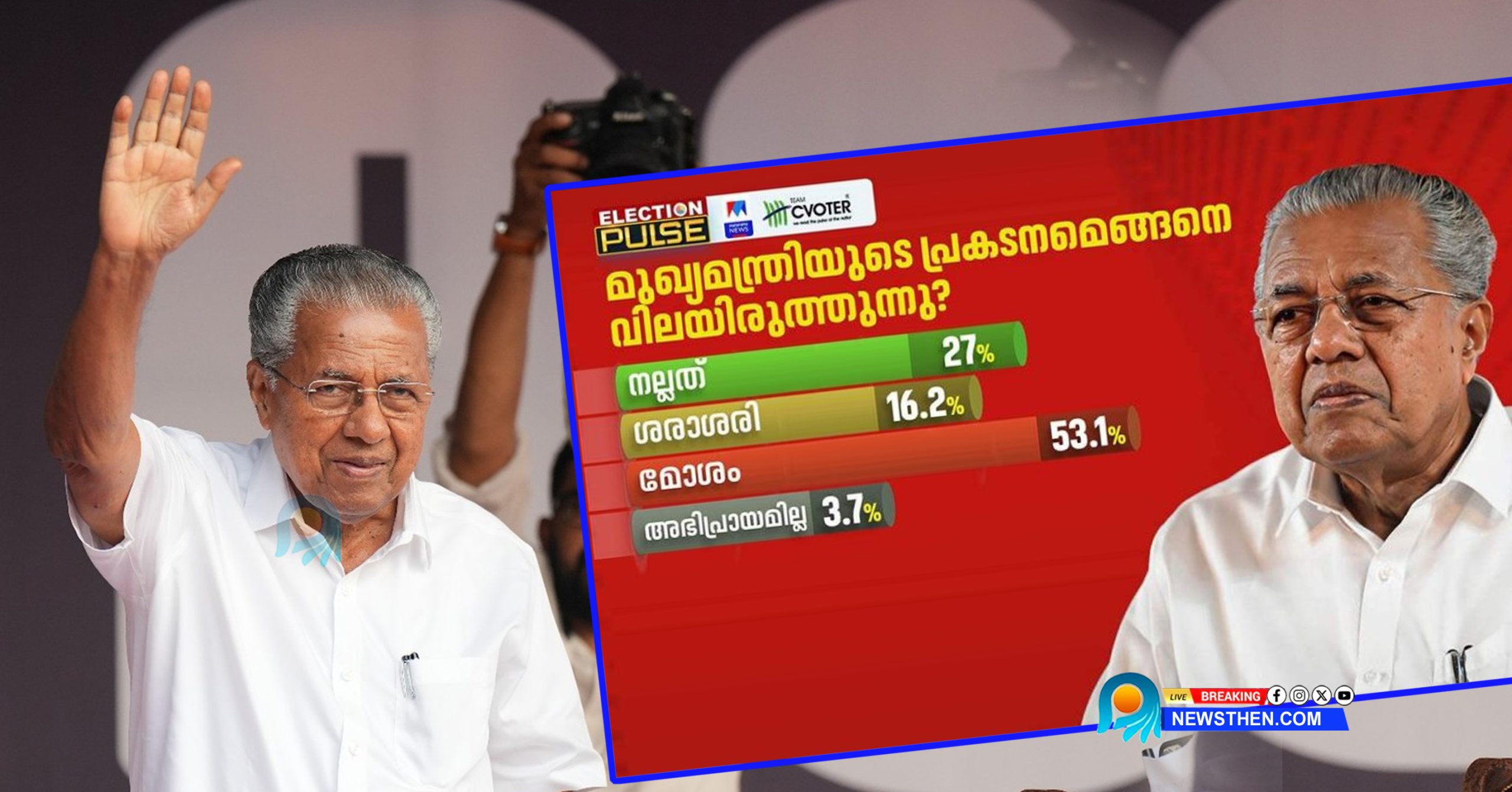 മുഖ്യമന്ത്രി എന്ന നിലയില്‍ പിണറായി വിജയന്റെ പ്രകടനം നല്ലതാണെന്ന് പറയുന്നത് 27 ശതമാനം പേരാണ്. ഡിസംബറില്‍ നടത്തിയ സര്‍വേയില്‍ പിണറായിയുടെ റേറ്റിങ് 29.1 ആയിരുന്നു. ജനുവരിയില്‍ 27.1 ആയി കുറഞ്ഞു. കഴിഞ്ഞയാഴ്ച അത് നേരിയ തോതില്‍ വീണ്ടും കുറഞ്ഞു. 27 ശതമാനം. മുഖ്യമന്ത്രിയുടേത് ശരാശരി പ്രകടനമാണെന്ന് കരുതുന്നവര്‍ 16.2 ശതമാനമാണ്. 3.7 ശതമാനം പേര്‍ അഭിപ്രമായമില്ല എന്നും പറഞ്ഞെന്നാണു റിപ്പോര്‍ട്ട്.