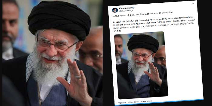 ‘‘സത്യവിശ്വാസികളുടെ കൂട്ടത്തിൽ ചില പുരുഷൻമാരുണ്ട്, ഏതൊരു കാര്യത്തിൽ അല്ലാഹുവിനോട് അവർ ഉടമ്പടി ചെയ്തുവോ, അതിൽ അവർ സത്യസന്ധത പുലർത്തി, അങ്ങനെ അവരിൽ ചിലർ (രക്തസാക്ഷിത്വത്തിലൂടെ) തങ്ങളുടെ പ്രതിജ്ഞ നിറവേറ്റി, അവരിൽ ചിലർ (അത്) കാത്തിരിക്കുന്നു, അവർ (ഉടമ്പടിക്ക്) യാതൊരുവിധ മാറ്റവും വരുത്തിയിട്ടില്ല’’… മരണശേഷം പുറത്തുവന്ന ഖമനയിയുടെ എക്സ് പോസ്റ്റ്