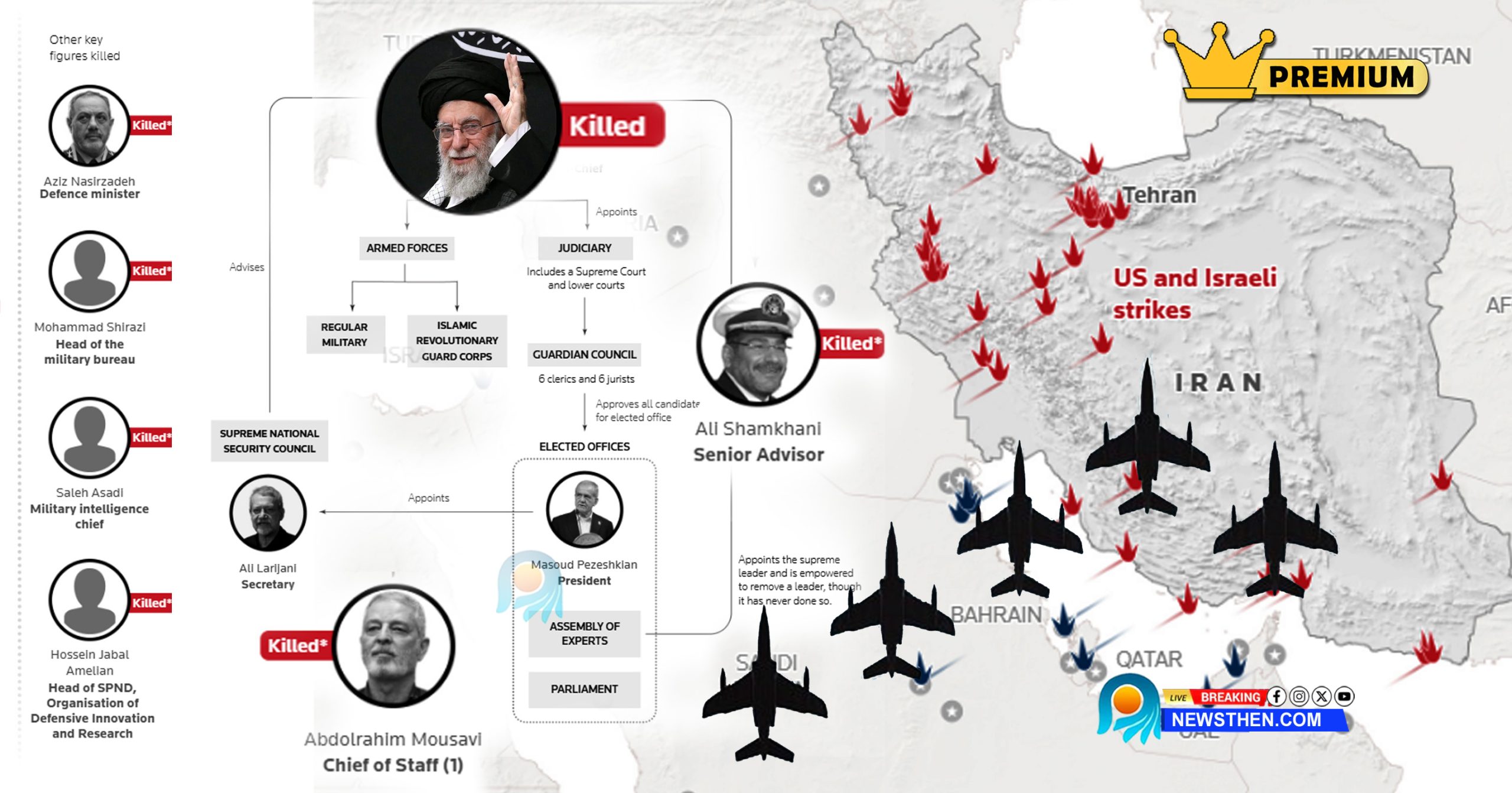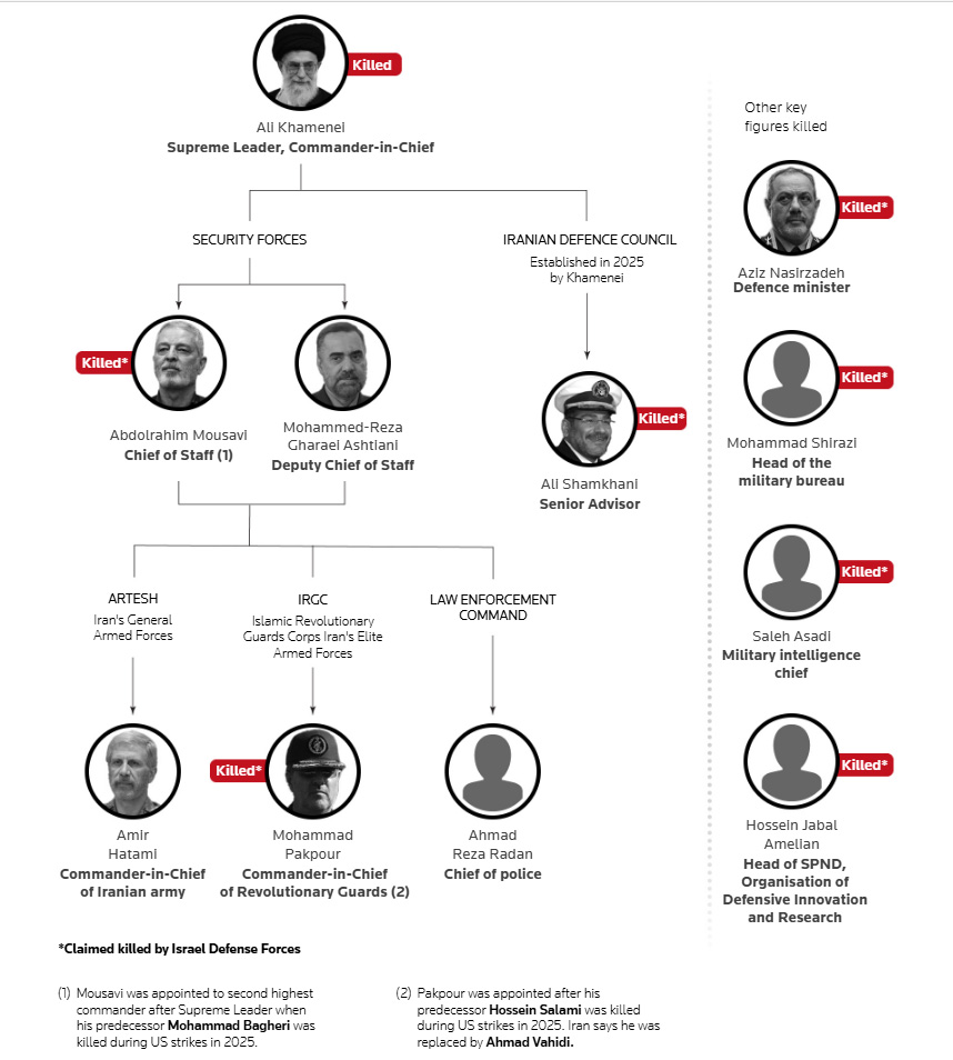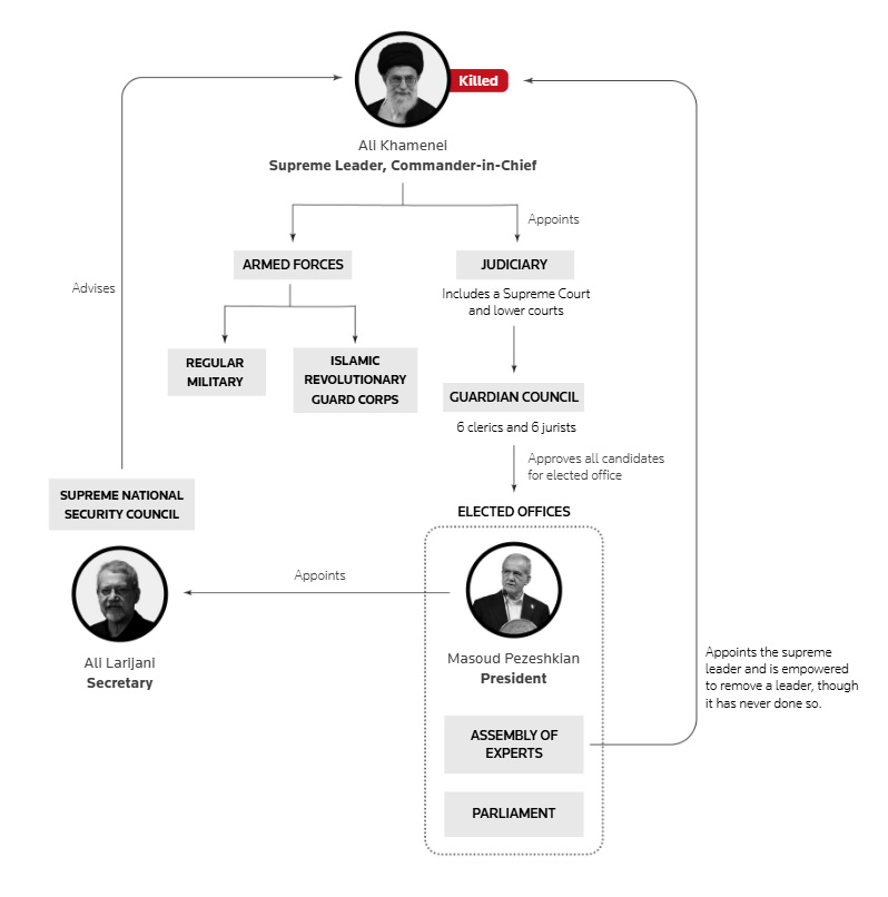 ഖമേനി മുതല് പെസഷ്കിയാന് വരെയുള്ള അധികാര ശ്രേണി; തലകളെത്ര ഉരുണ്ടു? തലവന്മാര് ബാക്കിയെത്ര? അമേരിക്കന്- ഇസ്രയേല് ആക്രമണം എവിടൊക്കെ? യുദ്ധം ഒറ്റനോട്ടത്തില്
